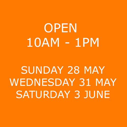 My studio will be open mornings only from 10 am – 1pm on Sunday 28 May, Wednesday 31 May, Saturday 3 June and by appointment by prior arrangement. If you want to come visit outside of these opening times, do get in touch, I’d love to see you!